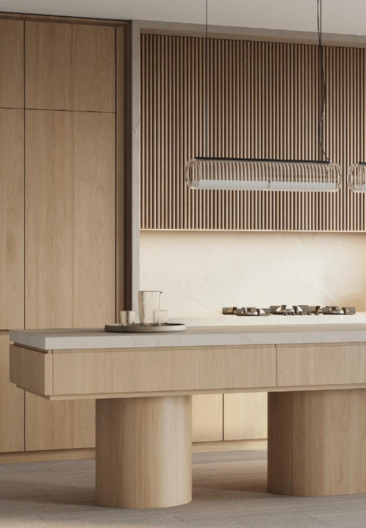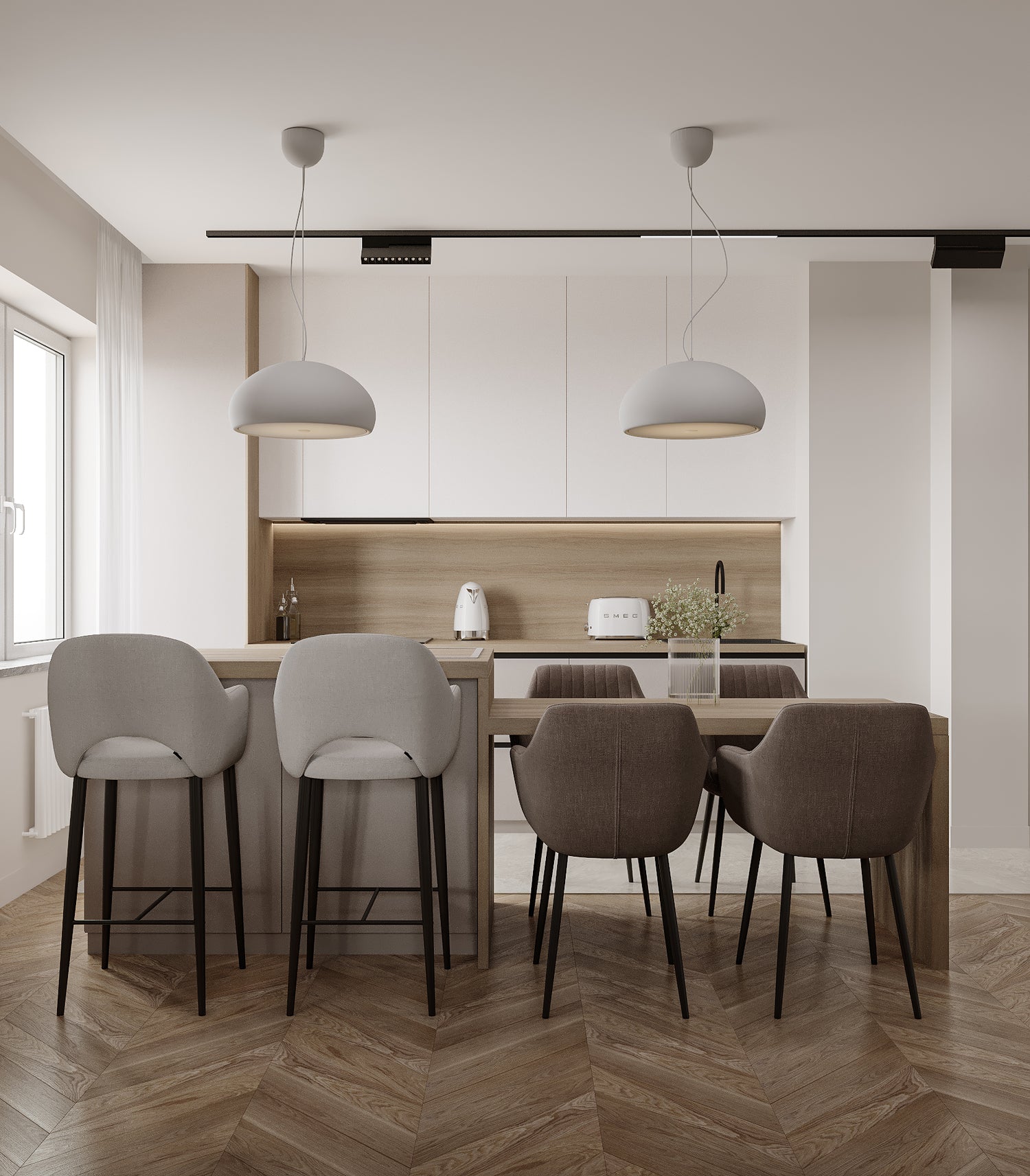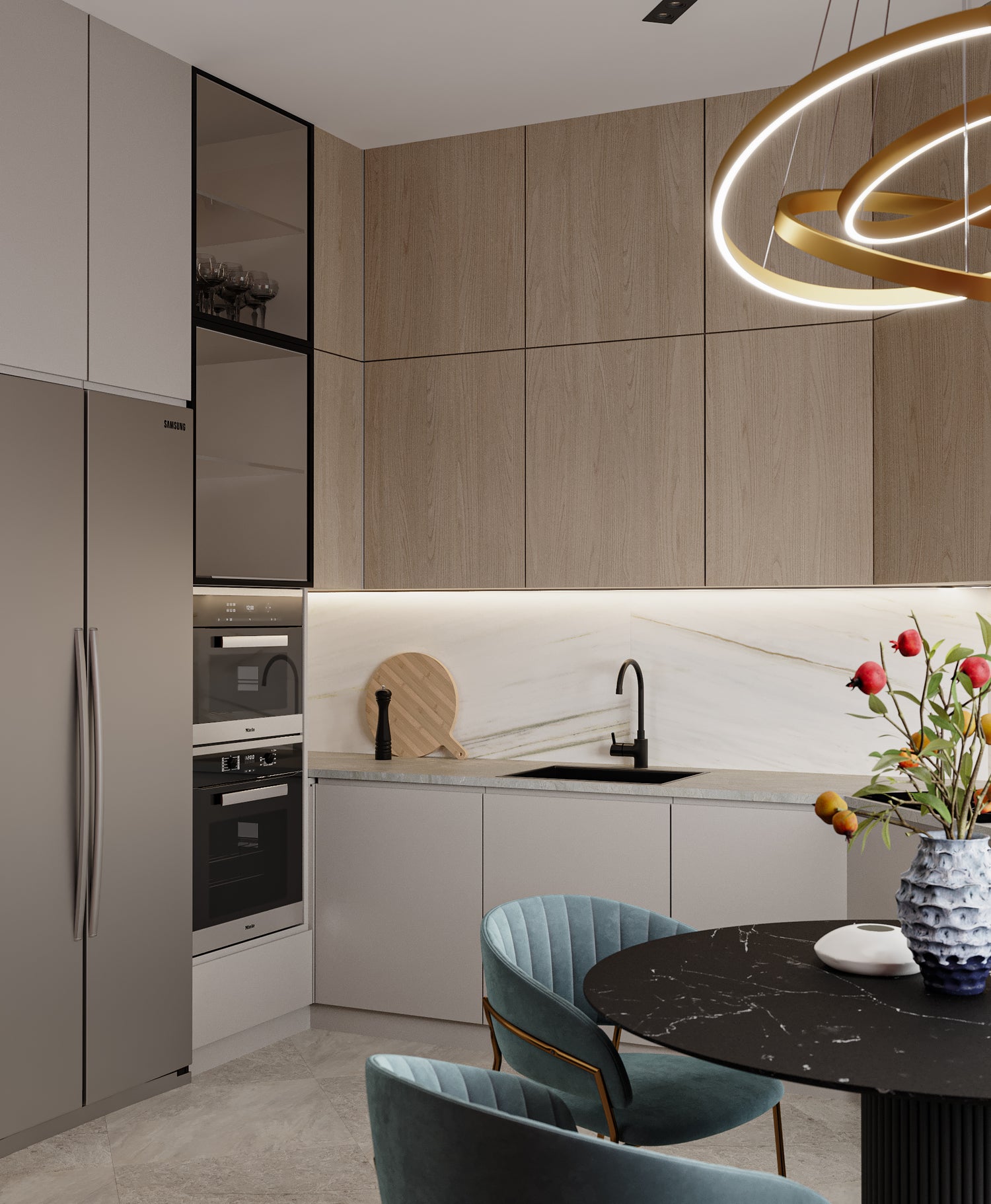Ivory Elegance: A Harmony of Natural Wood Veneer and Painted Fronts in This Kitchen Design